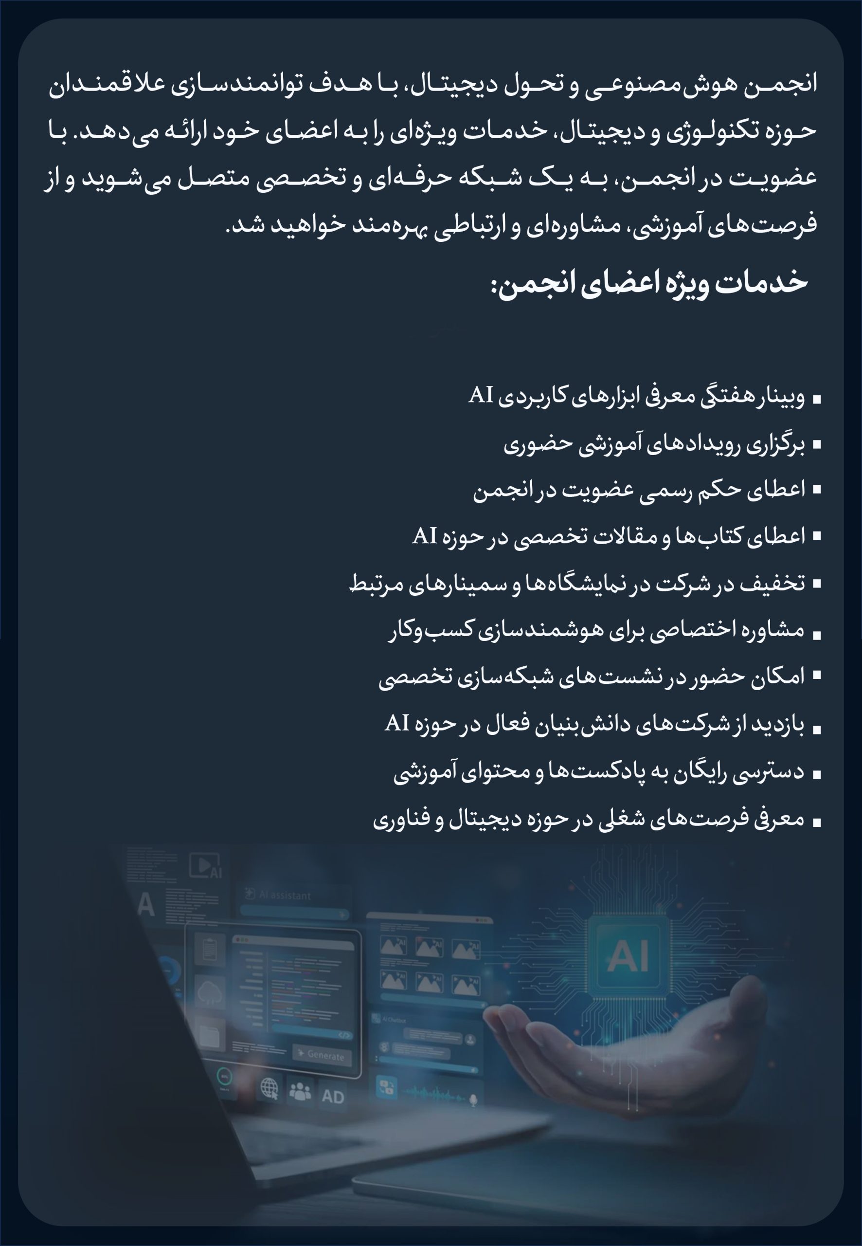 با هدف توانمندسازی علاقمندان حوزه تکنولوژی و دیجیتال، خدمات ویژهای را به اعضای خود ارائه میدهد. با عضویت در انجمن، به یک شبکه حرفهای و تخصصی متصل میشوید و از فرصتهای آموزشی، مشاورهای و ارتباطی بهرهمند خواهید شد.